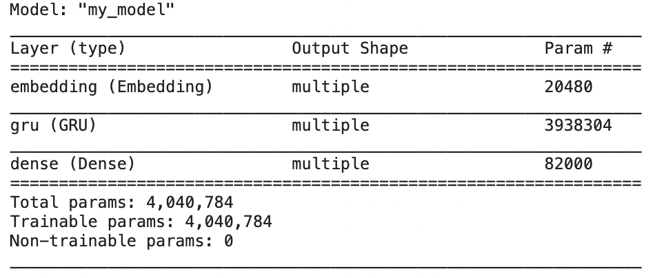 This RNN model is a sequential model where each layer is stacked linearly and one input is mapped to one output between each layer. Beyond the sequential model, graphs of layers are built with functional API to handle models with non-linear topology, shared layers, and multiple inputs or outputs. The model simply consists of 3 layers, an embedding layer to map characters onto the vector space, a GRU layer to process the embeddings into a new sequence, and a dense layer to produce the outputs.