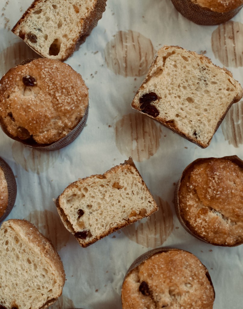 Fold the dried fruits into the dough, then transfer it into one 6.75-in or two 5.25-in wide panettone molds. I was able to make one 5.25-inch loaf and nine 2.75-inch panettonetti. Cover and let the dough rise again in a warm place. I left it by the oven light bulb. It should take about 4 hours for the dough top to reach the height of the mold. It takes longer starting from refrigeration. Sprinkle with plenty of raw sugar.