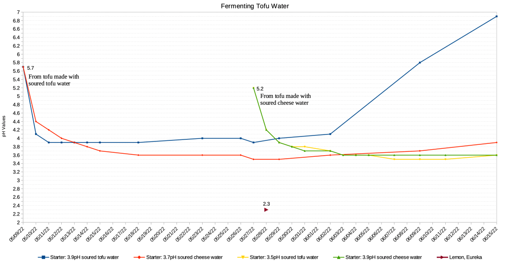 2. Cheese whey can ferment by itself, but tofu whey needs a mother of whey, aka a starter. Soured cheese water can be used as the starter for tofu whey. Ambience temperature, the strength of the soured whey, and the ratio of soured whey to fresh whey all affect souring speed and strength. Using ~20% starter, it takes ~4 days for the fresh tofu whey to reach 3.9 pH. Attaining a lowest pH value depends on the starter’s strength, but they don’t appear to dip below 3.5 for tofu whey fermented with either soured cheese water or soured tofu water.
