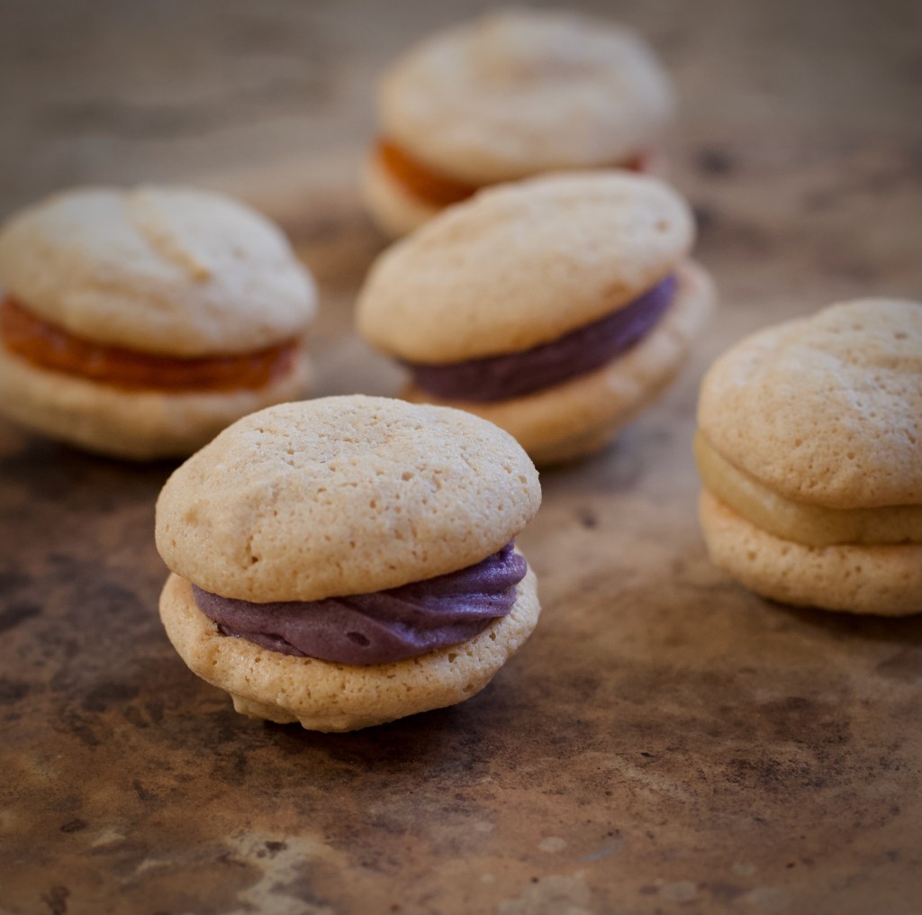 Sweet potato butter cream is denser, good for filling macarons. Macarons are almond flour cookies sandwiching a ganache. They are fickle and delicate. To make macaron shells calls for powdered sugar and super fine almond flour, of which I don’t typically carry around. I used granulated sugar, which made shells that were not hollow, but more porous with an intensified nougat-like, chewy texture. Colorful macaron shells are mostly made with food coloring.