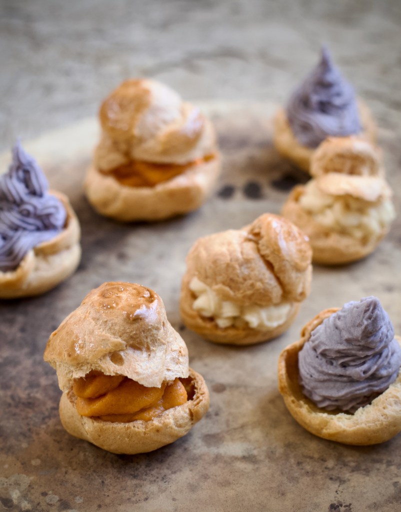 Sweet potato Chantilly cream is light and airy, good for decorating cakes. I used it to make cream puffs. Cream puffs are typically filled with pastry cream, but the sweet potato Chantilly cream worked beautifully here – beautiful and tastes great, but clearly I need to invest in better piping tips!