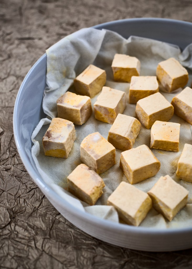 Use only extra firm tofu and we will still need to further dehydrate it with a salt soak and compression. Bring the tofu to a boil in heavily salted water, keep it boiling for 3 minutes, then turn off the fire, cover, and let it sit in this salted water for another 10 minutes. It is a misconception that tofu easily takes on any flavor imparted upon it. Give it a taste and you’ll see that it does not take on salt even with heavily salted water. However, salting the surface draws out surface moisture and helps eliminate unwanted molds. Line the bottom and top of the tofu with a towel and compress it for 2 hours. I used a couple of 12-inch cast iron skillets for compression.