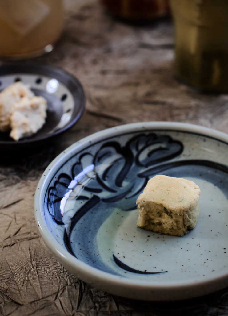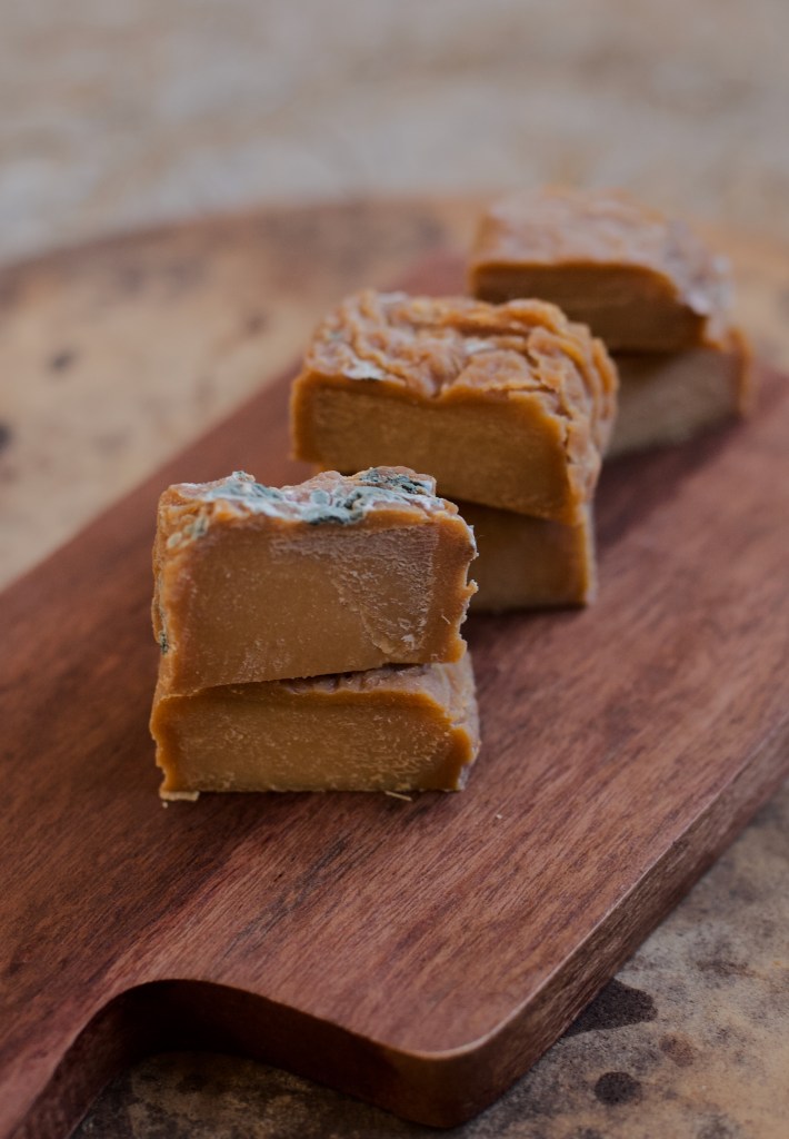 For only about a week, the wrapping cloth remained moist. After a week, it started drying out as mold also started appearing on it. Mold development was similar to making miso and considered normal. From here, there were two ways to fermentation. Keeping the container closed prevented moisture loss, and the tofu fermented while remaining soft. Like miso, it takes months to become soft and creamy in texture, and longer fermentation time yields sharper, funkier, and cheesier flavor. Do taste test after a couple of months to observe fermentation development. Similar to Chao Tofu, it can be made into a condiment, but also appreciated as-is and as a spread.
