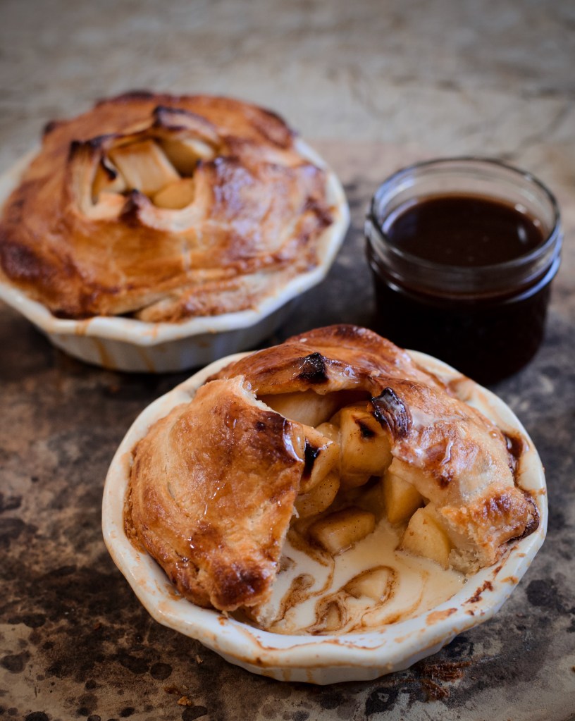 For the apple pie: Peel and core 1½ pounds or 3 large honey crisp apples, dice into bite-size cubes, and then mix with ¾ cup brown sugar, 1 tbsp lemon juice, 2 tbsp dark rum, and ½ tsp salt. Place the apple cubes into a strainer and refrigerate them overnight while collecting the drained syrup. On the next day, mix the apples with 1 tsp vanilla extract and ½ tsp lemon extract before baking.