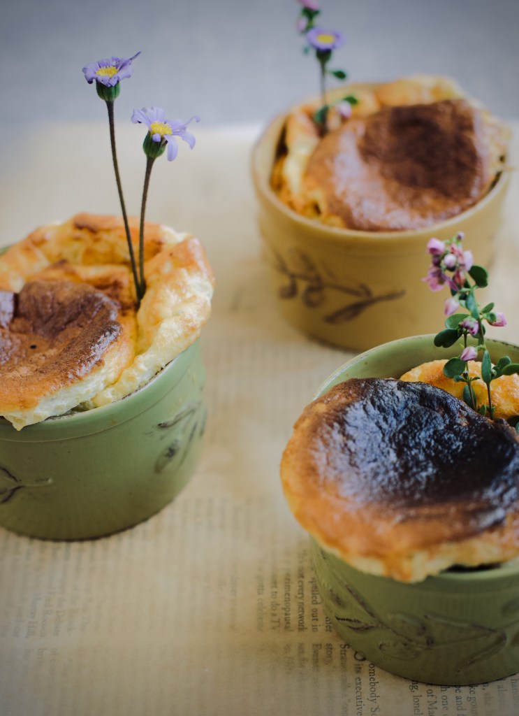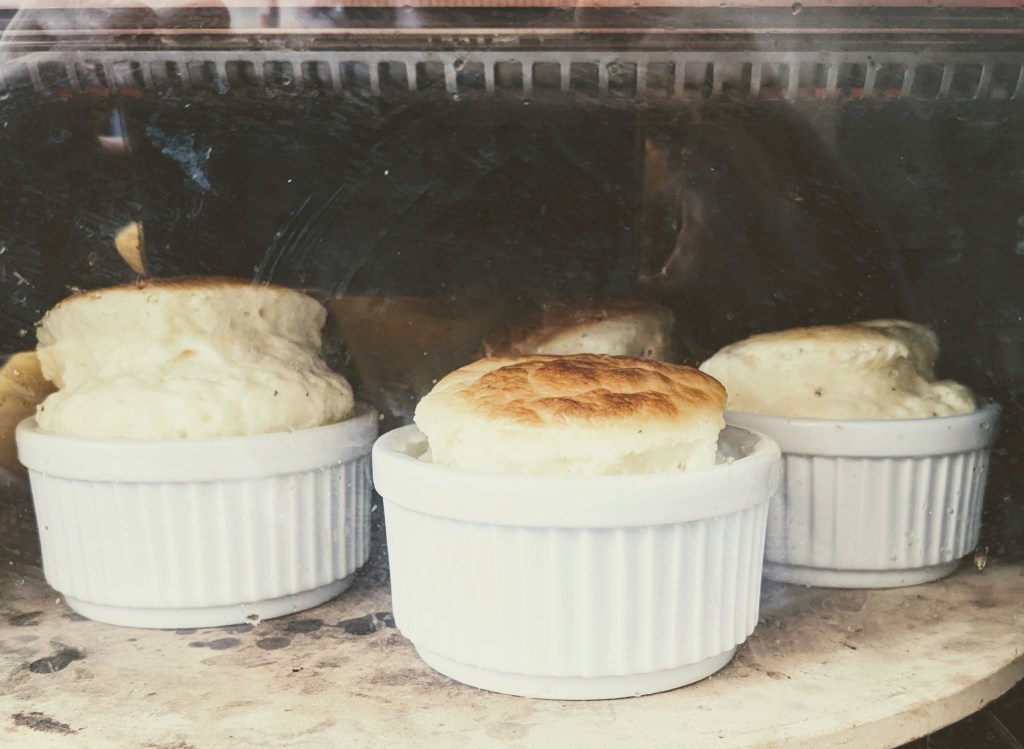 Next to heat and steam, another technique for a high rise is to trap air by whipping the egg whites into foam. It is employed in the soufflé, another type of batter without a leavening agent. In Bake Wise, Shirley Corriher prescribed folding a hot cooked dough into the egg-white foam to ensure a warm batter before going into the oven. Observe that from oven to photo, the soufflé was already deflated, as it’s meant to be served immediately.