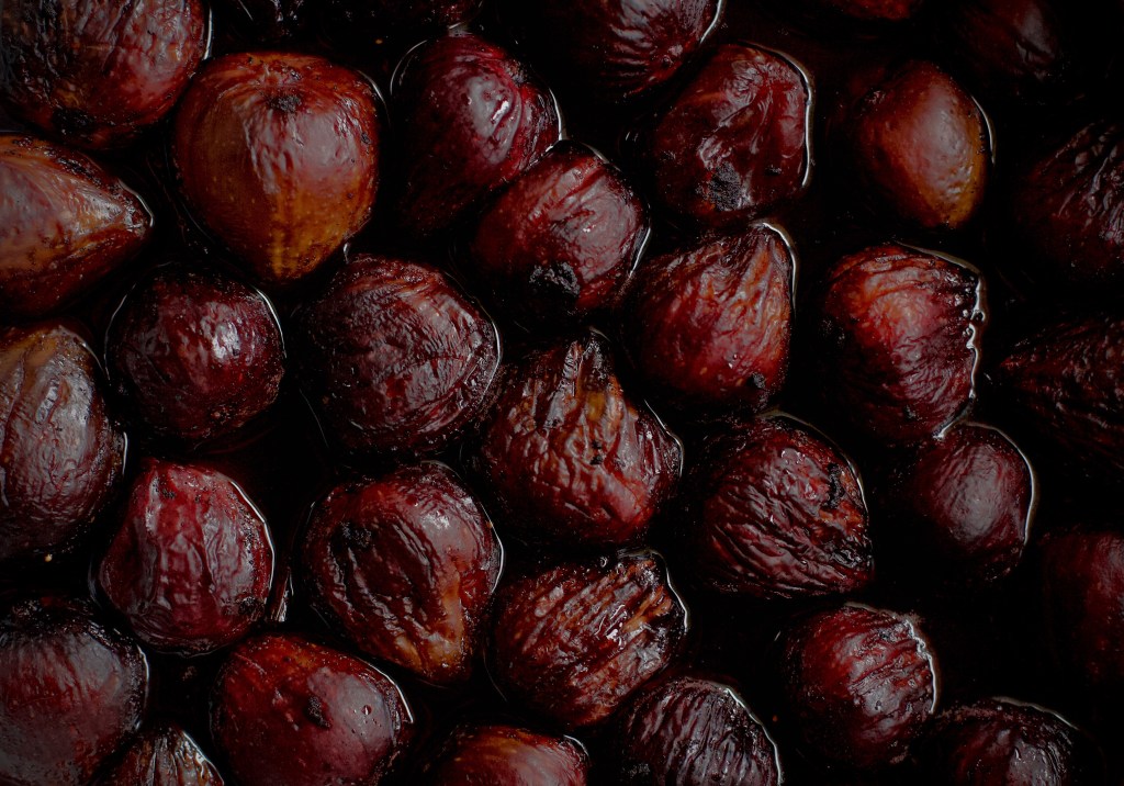 This method works well for fruits that do not peel well, such as fig. Figs are first cooked in sugar over low heat and rested in between cooking in order to firm up and remain intact. Pour ½ cup of sugar to cover the bottom of a 10-in ceramic dish, lay 2 lbs of the figs atop the sugar in a single layer, and pour another ½ cup of sugar atop of the figs. Add a pod of vanilla, scraped seeds and all, to the figs. Cover the dish with an opening to let steam escape and cook over low heat. Once the syrup comes to bubbling, cook for another 10 minutes, then let stand for 4 hours and repeat twice more until the figs are translucent. Alternative to the stovetop method, bake the figs for 40 min @ 280F. If it cannot be done in one day, refrigerate in between cooking.