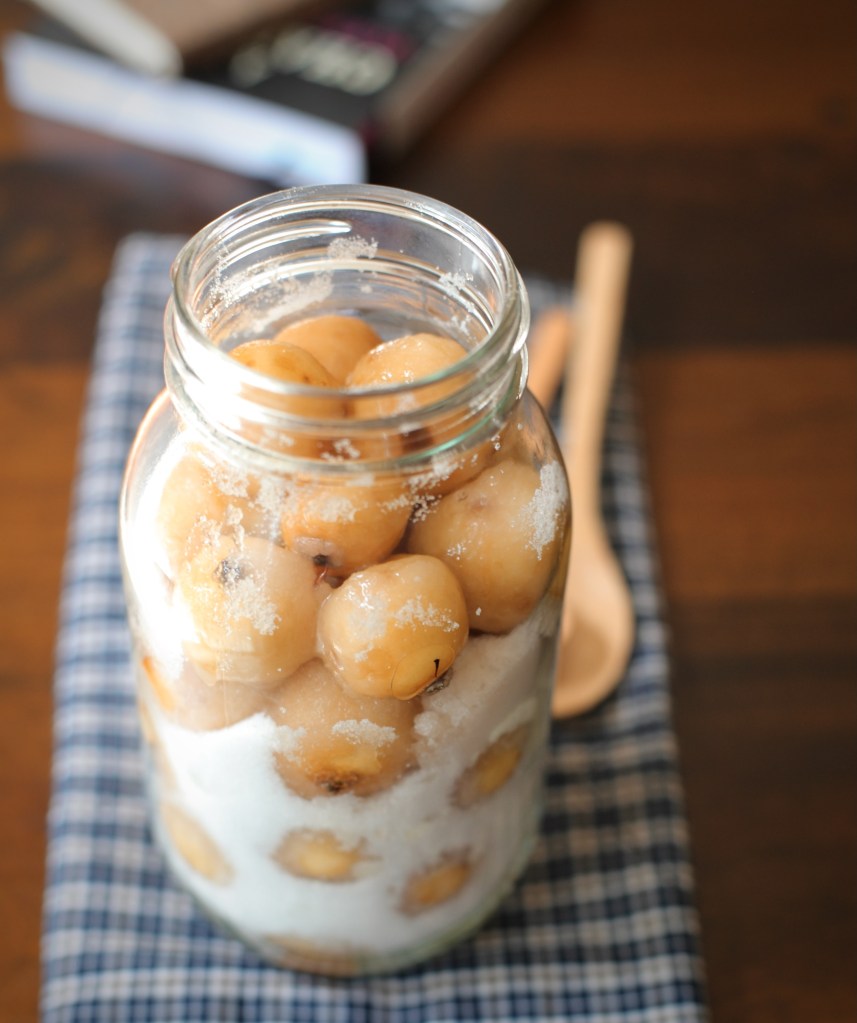 Another less popular, but more exciting, way to preserve fruits is brandied. Brandy means burnt wine in German, named for spirits distilled from fermented fruits. In this brandied method, natural yeasts occurring in fruits digest sugar into alcohol. Brandied fruits are sweet and boozy, much more interesting taste-wise. Until the yeast makes alcohol, the fruits need to be kept safe from molds. Ensure the jar is sterilized, then douse peeled fruits in sugar and top up regularly until you see bubbles coming atop and smell a yeasty alcohol aroma, somewhat similar to fermented bread dough. Once the yeast starts making alcohol, it will also release plenty of carbon dioxide, keeping mold away. For this same reason, fill the jar to leave only a little space atop and keep it well lidded. It is not necessary to top up with sugar once the yeast starts working. For my brandied plums, it took 10 days to see visible bubbles. Taste regularly and keep refrigerated once it is to taste, else the yeast will continue to turn sugar into alcohol.