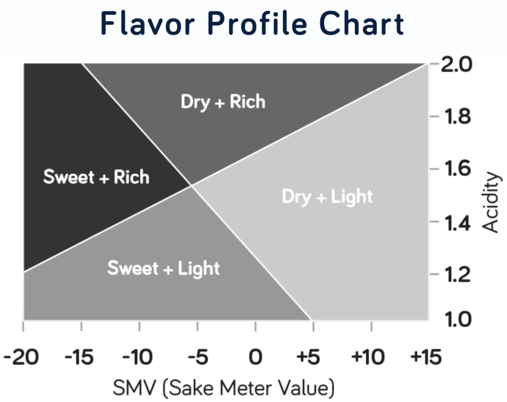 Sake evaluation looks at two metrics: Nihonshu-do, the sake meter value, and its acidity level. SMV measures the sugar content and gives insight into the sake’s sweetness in taste. Acidity level refers to its acid content: a higher value signals higher acidity. Acidity balances out the sweetness and gives a richer body. Both metrics can be computed based on specific gravity and pH measurements. To compute SMV: SMV = (1÷SG1 – 1)*1443 → SMV = -16.5.