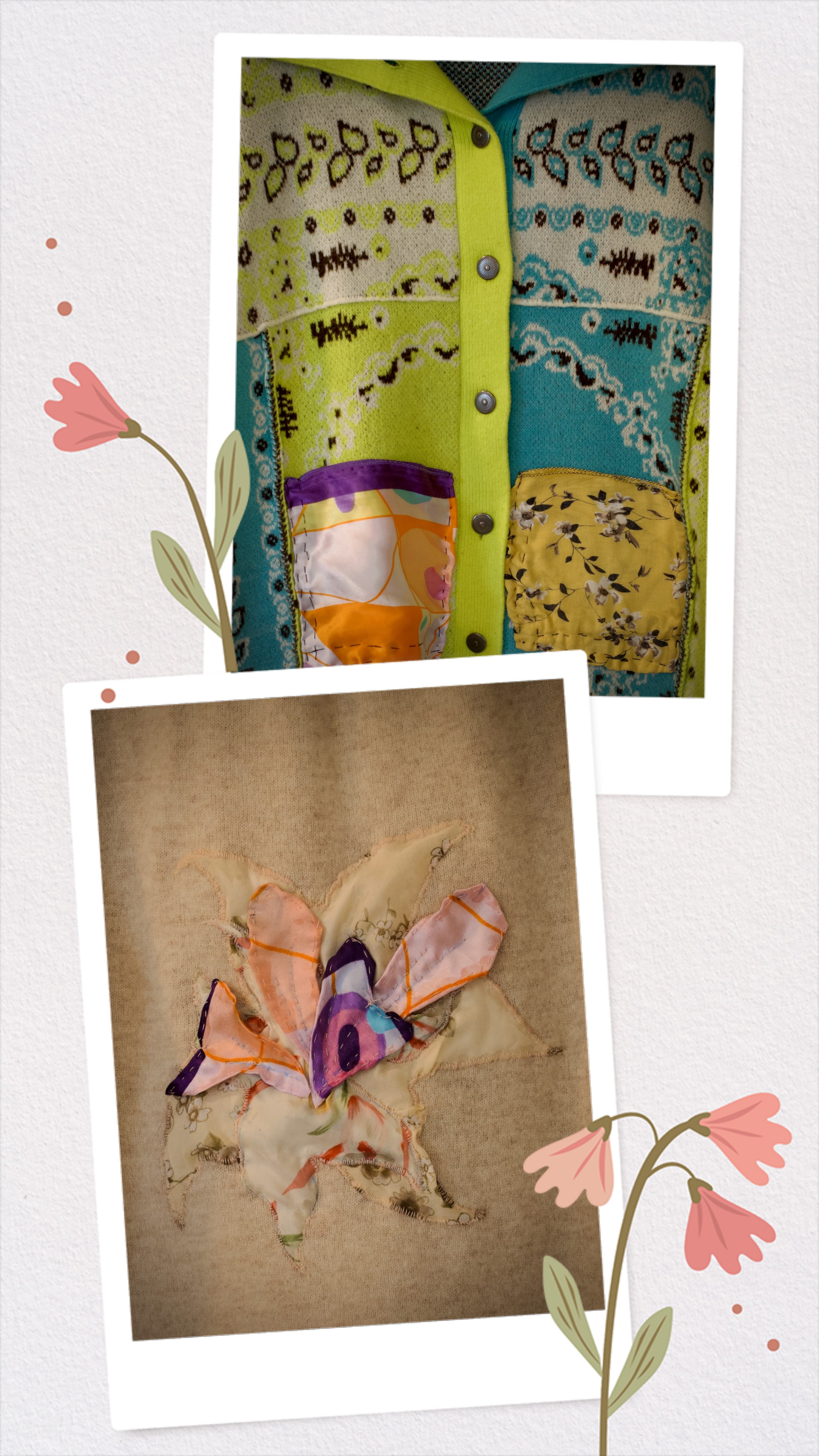 Any fabric can be kept for patching, but my favorites are old scarves. They are bright, colorful, patterned, and soft, which makes sewing them onto other fabrics easy. They are also great for adding pockets to jackets. I can take advantage of the already sewn in edges to reduce the amount of sewing required. To prevent fraying of cut edges, use pinking shears, whip stitches to hem, or fabric glues if necessary. Tailoring is a time-consuming activity, only worthwhile for your beloved items. Otherwise there’s always fast fashion.