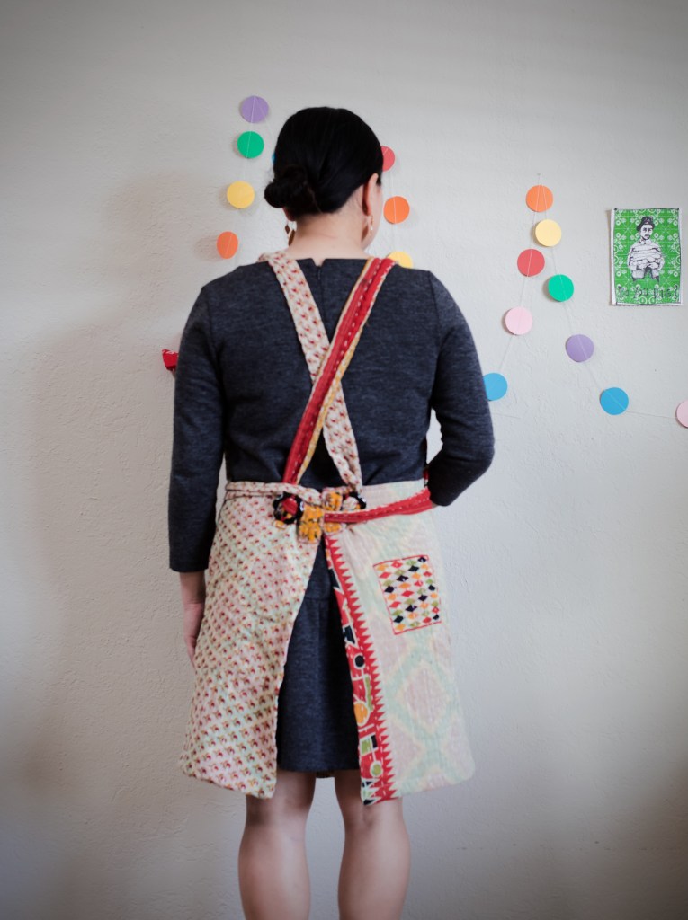 Flairs – Instead of punching a couple of holes for grommets, I opted for something like belt buckles so the straps can sieve through smoothly. Pocket flaps add charm. This apron is made with vintage kantha quilts, which are stitched together from recycled cotton saris.