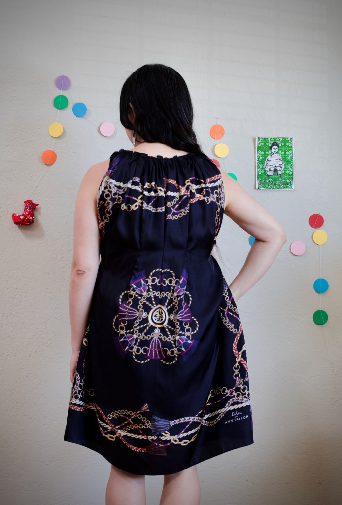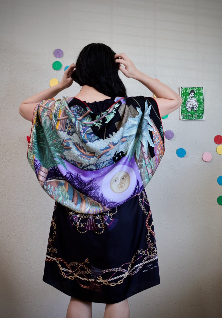 For this experiment, I have transformed two identical square scarves into a little black dress, or as we have affectionately abbreviated them – the LBD. Its construction is simple – the neckline is fitted by gathering an edge into pleats, few darts are sewn in to hug and drape along the body, and the dress flares out toward the bottom hem as wide as the scarf’s edge, creating a flattering A-line silhouette. With only a small button to tie at the neckline, putting on this dress is also easy. The fabric is silk, lending a smooth silky feel to wearing it.