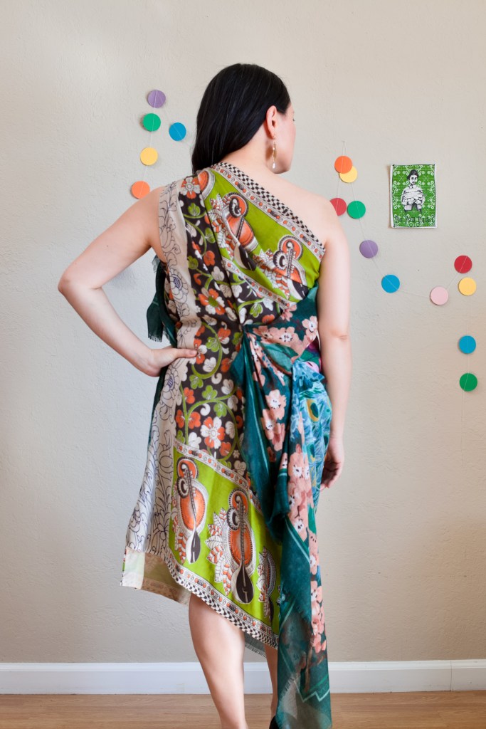 For this ensemble, the base dress is crafted from a cotton rectangle, which comes from a vintage cotton sari of floral and peacock details. The base dress is molded from the rectangle without any cutting and knotted at the shoulder. Donning atop is a silk-cashmere square with a most gorgeous peacock motif.