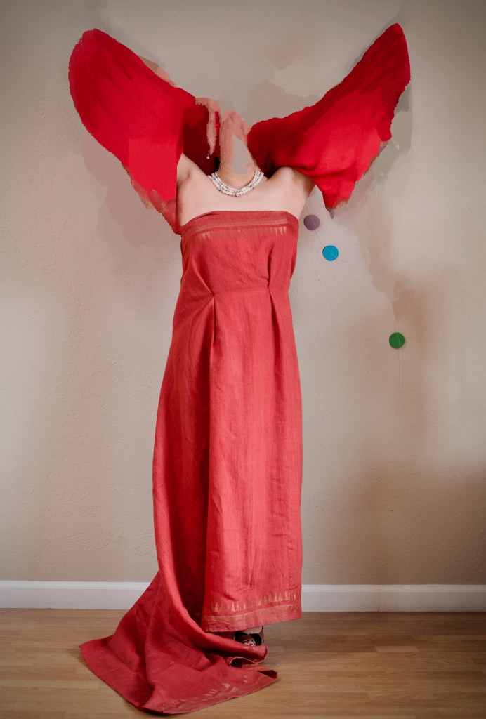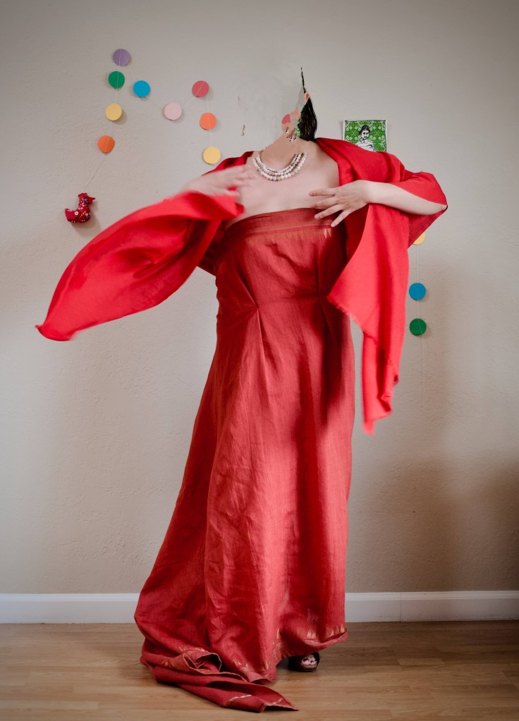 As the French fashion designer Hubert De Givenchy said of her, “There is not a woman alive who does not dream of looking like Audrey Hepburn,” we can all admire this icon of elegance and grace and emulate her style. This gown in red is homage to Audrey’s impeccable dance as she sweeped down the Daru staircase of the Louvre. She’s donning a glorious red gown, her red scarf floating through the air, mirroring Nike, the winged goddess who heralds victory of Samothrace in the background. A rectangle cloth, which comes from a silk-blend vintage sari, swathes around the body with an ample fishtail train. Without any cutting, the gown hugs the body with double hook closure, front darts, and a back-stitched floral bow.
