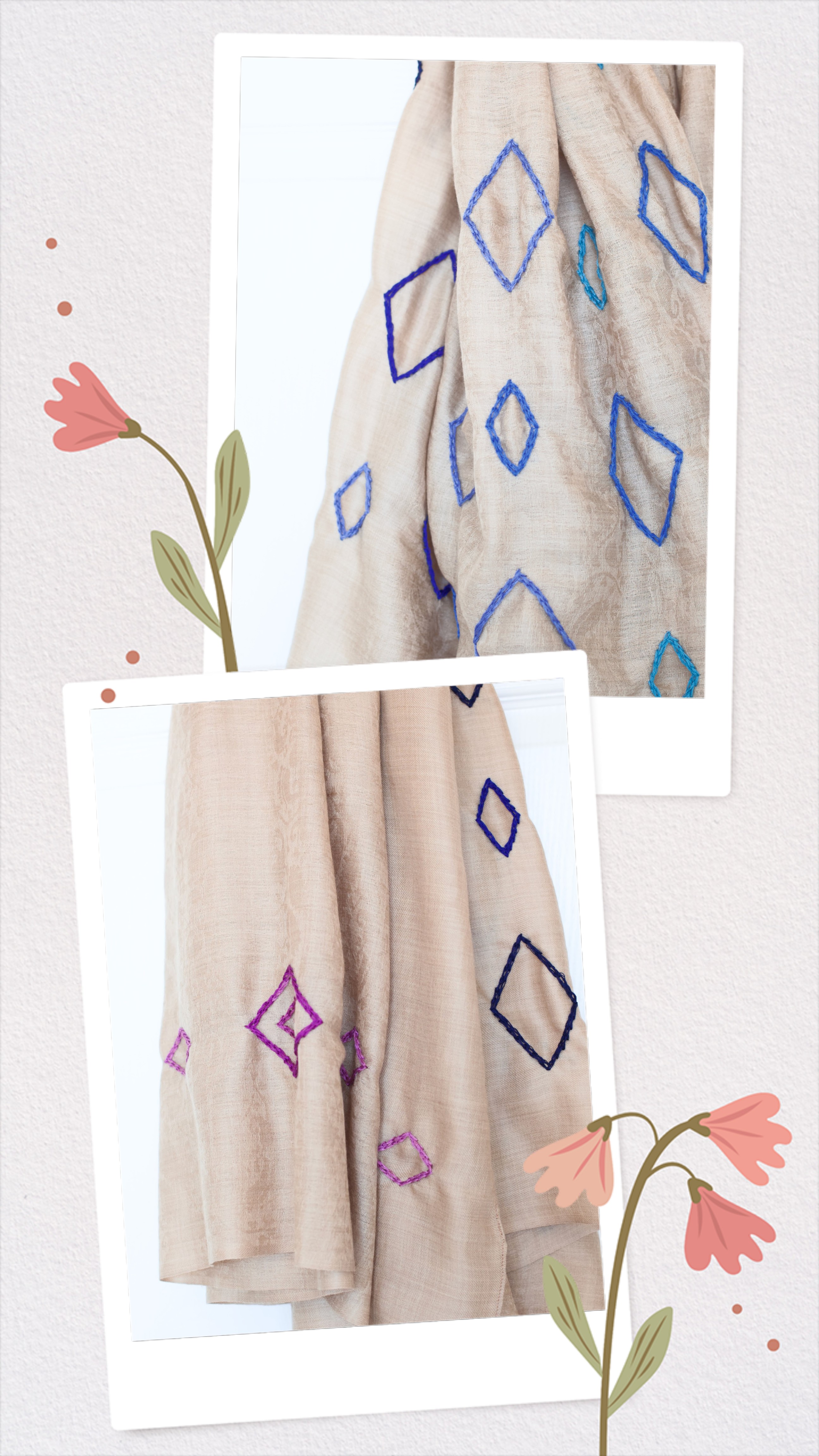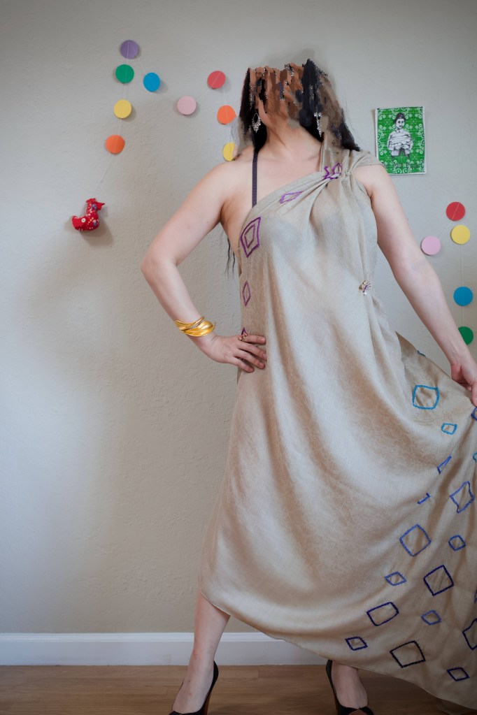 Contemporary blue has become a most favorite color and a most favorite word. From blue jeans, blue collar, blue ribbon, to blue chip – true blue has come to express that which is faithful and loyal. Molded from one jacquard wool square, this dress is to reminisce the Roman stola. Diamonds of blue gradient are embroidered across, and the border is embroidered with diamonds of purple gradient. Worn with a palla, the ensemble is the attire of our Lady of Liberty.
