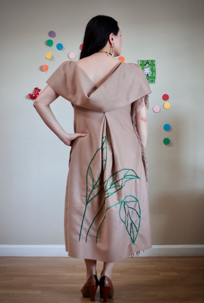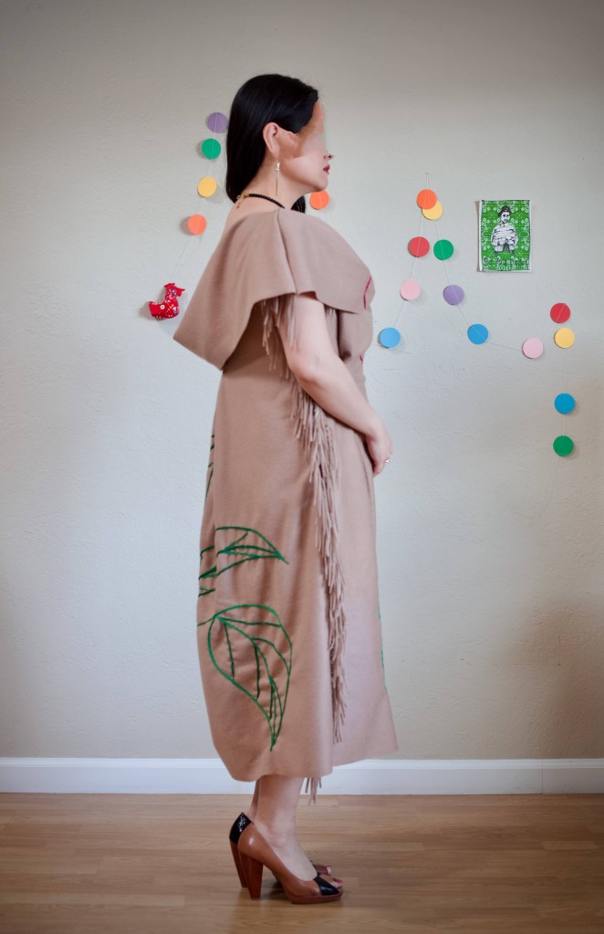 I’m at the beach now. There’s a child of the sea sauntering barefoot in her bird-of-paradise bathing suit. She’s spooning papaya flesh like she’s scooping sunset. This dress, molded from two cashmere rectangles and adorned with embroidery motifs of the bird-of-paradise flower, is for her – she with Aurora’s face in saffron dreads, like a rag doll. My eye candy.