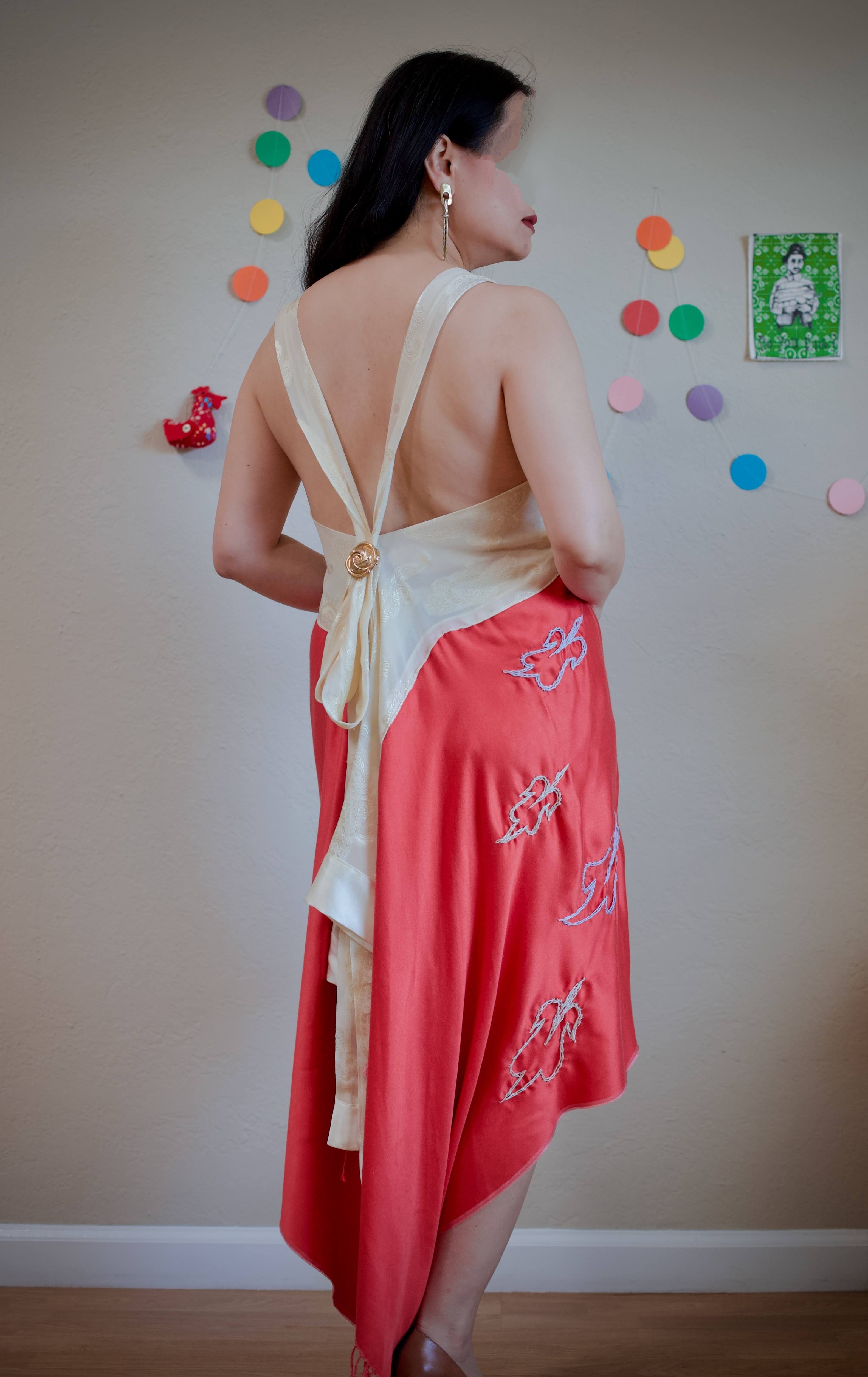 I have a pink flamingo in my garden too, but it’s made of iron. In the 21st century, plastic is no longer the hottest thing since sliced bread. It’s been rusting and fading color over the years, giving its own charm and timelessness. Something possesses a naturally enduring quality. Inspired by the flamingo, this dress is molded from a silk rectangle and accentuated with a cream colored scarf to represent the natural colors of the flamingo. With a drifting feather embroidery motif and floating tail, it evokes the ethereal quality of the bird.
