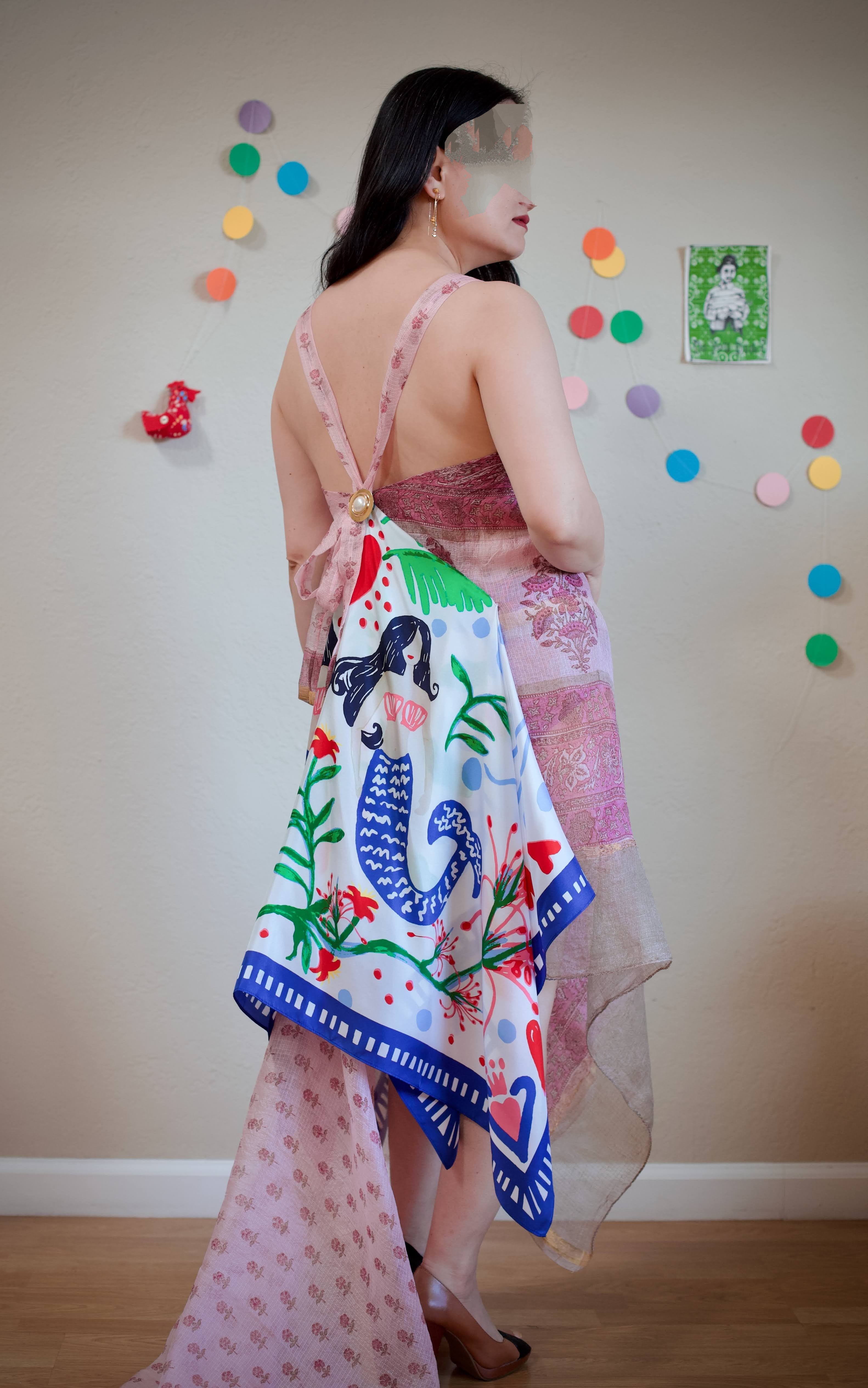 The sun rises out of the sea; his rays fall with gentleness and warmth upon the cold sea-foam. Above the little mermaid hover hundreds of transparent beings; their language melodious, but so ethereal that no human ear can hear them, no earthly eye can see them. They’re lighter than air and float about in it without wings. Then she notices that she has a body like theirs, which rises higher and higher out of the foam. She has transformed into a daughter of the air. The daughters of the air have no immortal soul either, but after 300 years of good work, they may gain one to float into the eternal Kingdom of God. For the little mermaid with the best heart of them all, this dress is molded from a silk rectangle, block printed with rose motifs. A silk square of mermaid print adorns the back of the dress.