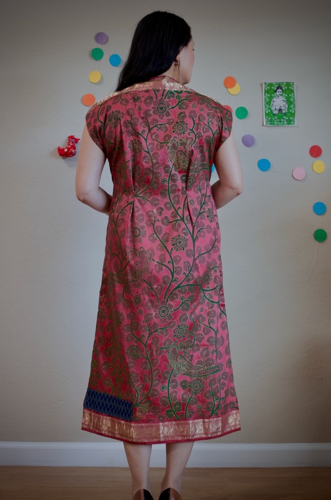 To celebrate the Lunar year of the snake, this dress is molded from two silk rectangles, which come from a vintage sari. It is adorned with a patchwork motif representing the snake.