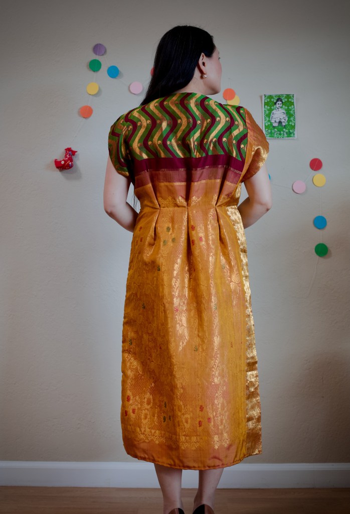 With the impending Great War of 1914, the Vienna Secession came to an end, but the artist and the movement’s triumph are historically sealed as the founder to the most significant period in 20th-century Austrian art. His work is forever an inspiration for their richness, tenderness, and thought-provoking concepts. Inspired by Gustav Klimt’s golden art, this dress is molded from two rectangles woven with golden zari threads on silk cloth, which come from a vintage sari. To accompany the dress is the head scarf, which is hand painted with a motif inspired by Danaë’s purple veil.