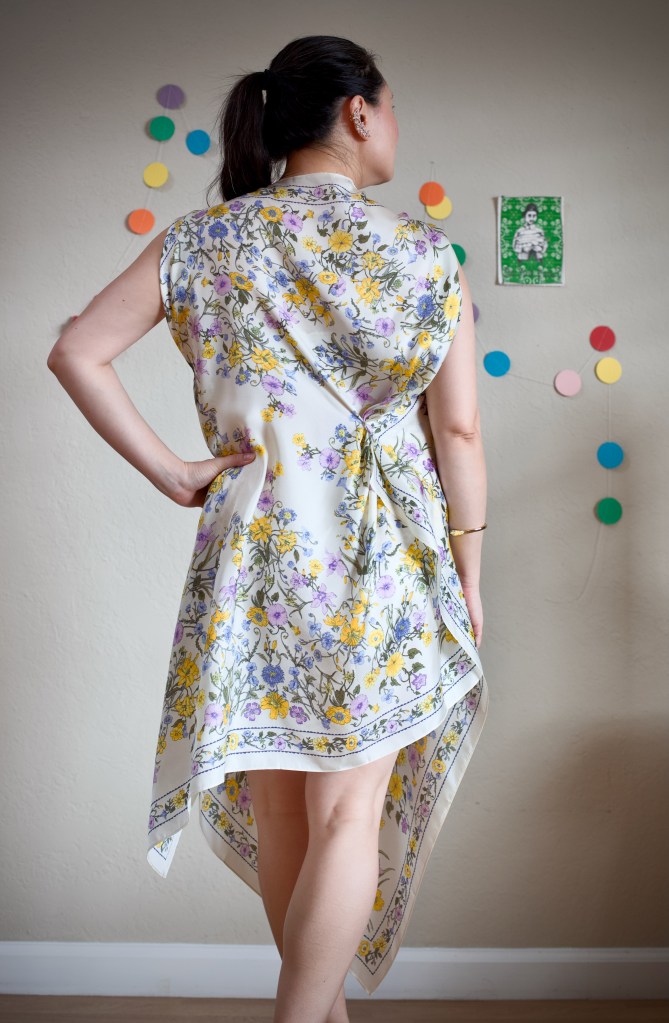 As flowers have not evolved to bloom for us, humans have not evolved to need them to survive. Yet, what is life without flowers? In Dead Poets Society, John Keating said, “We don’t read and write poetry because it’s cute. We read and write poetry because we are members of the human race. And the human race is filled with passion. And medicine, law, business, engineering, these are noble pursuits and necessary to sustain life. But poetry, beauty, romance, love, these are what we stay alive for.” So it is flowers who are the poetry of life. Inspired by the bloom of spring, this dress is molded from two silk squares, printed with flowers of purple and yellow hues. The scarves are made from fine silk, adorning an effortless and ethereal feel and look.