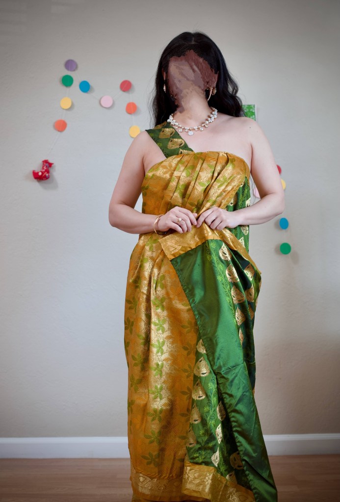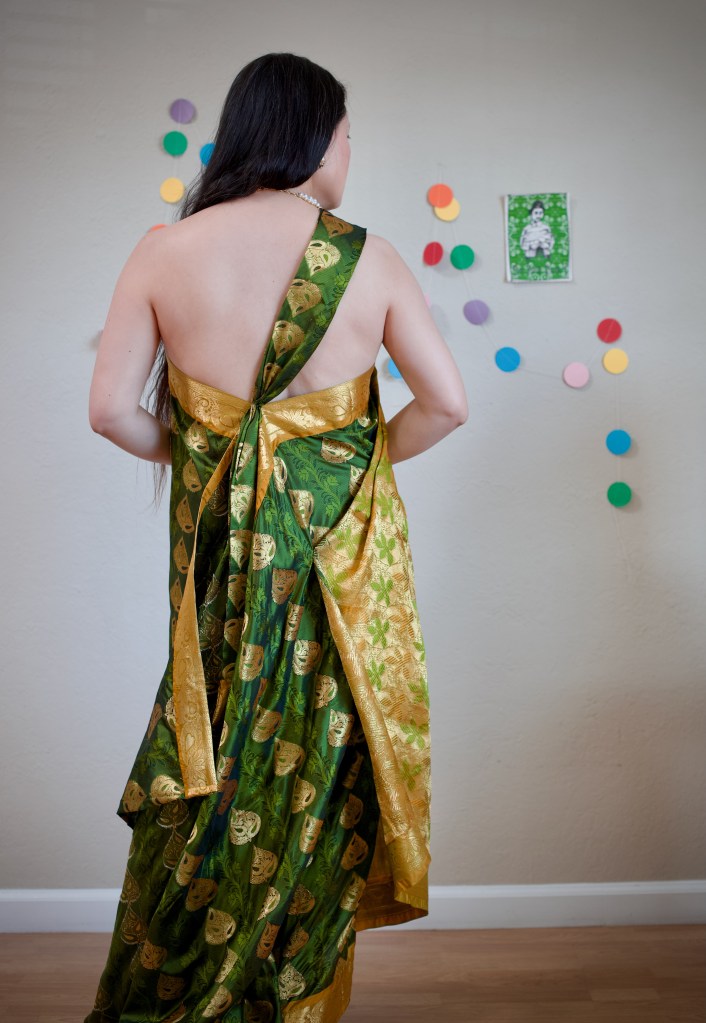 To celebrate the gold leaf bride, who comes bearing golden fortune, this bridal gown is molded from 2 silk rectangles woven with a gold leaf motif, which come from a vintage sari. May the wealth she brings give her the status and power that she desires, but if all else fails – the freedom that she needs.