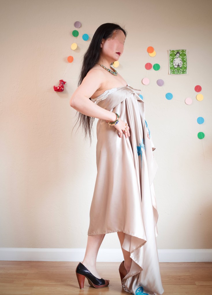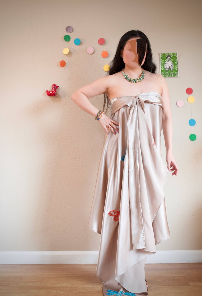 Inspired by the dragonfly, I have crafted this dress from a silk rectangle, embroidered with orange and blue dragonfly motifs. Atop the dress is meandering fabric patchwork to symbolize water, where the dragonflies converge. I, too, have written my own haiku to extol the dragonfly of my dream: