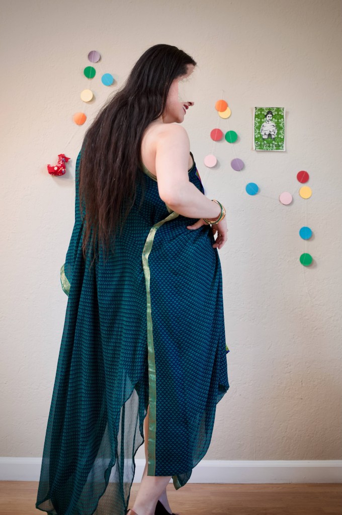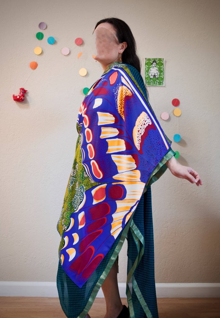 Since 1954, the garden has been restored, attracting curious visitors from around the world. It became a delightful find for surrealist artists such as Salvador Dali. Now locals come here to relax, to stroll, and to picnic on Sunday. Perhaps it serves as a reminder that man’s fury and murderous tragedies, even those written into stone, shall fade over time. What’s left behind are fables and fairy tales, and spiritual enchantments. Inspired by the spirit of the forest, this dress is crafted from a silk rectangle, adorned with a silk square of butterfly and bird motifs, feathers and quills, gliding above a dense, deep forest.