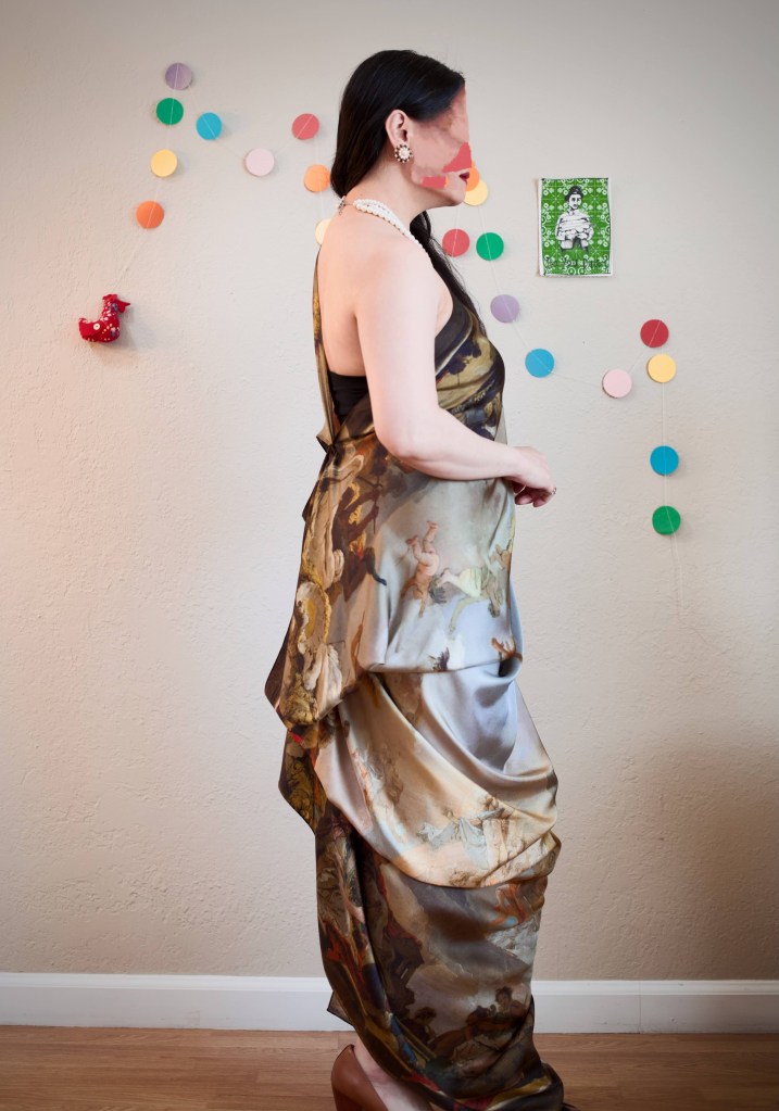 This dress is crafted from a silk rectangle, featuring Tiepolo’s preliminary sketch of the Allegory of the Planets and Continents that he would paint over the vault of the Würzburg Residence. The painting depicts Apollo about to embark on his daily journey across the sky. Deities surrounding the sun god to symbolize the planets include Venus, Mars, Mercury, Jupiter, and Saturn. Allegorical figures at the four edges personify Africa, the Americas, Asia, and Europe: the ebonized matron of Africa atop her camel, the elephant and chinoiserie of Asia, the feathered headdresses of the Americas, and Europe, spanning from Greece and Rome to Emperor Frederick Barbarossa, to bishops, cardinals, and princes. Here all of the artist’s favorite themes are in evidence: the fierce physiognomy of wanton old men, a self-portrait, an idealized portrait of the patron, Chronos, Apollo, and the Muses.