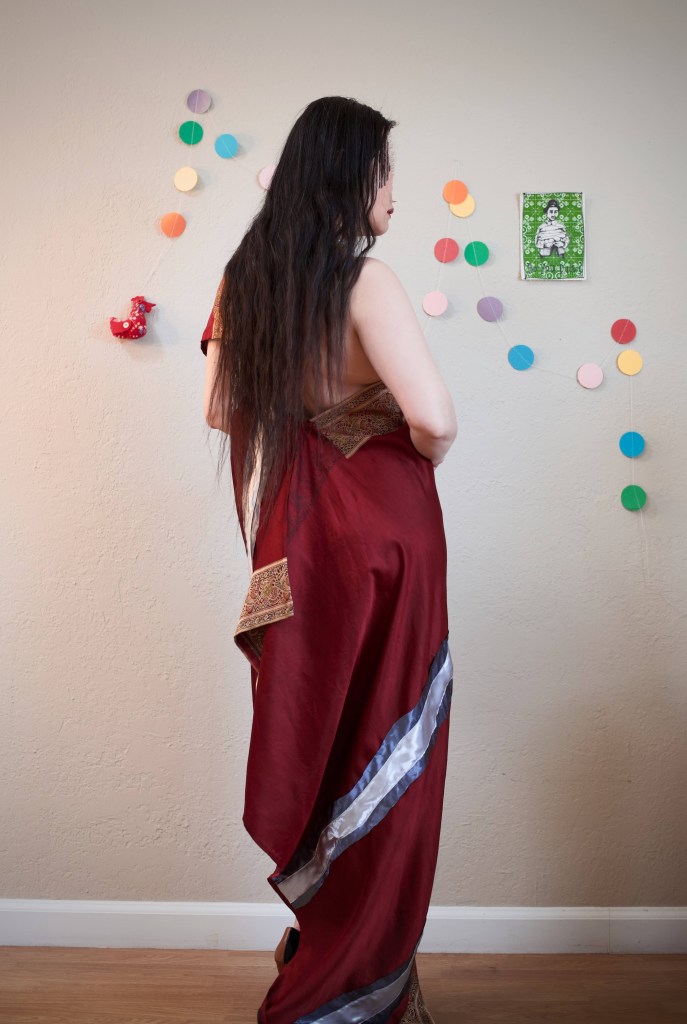 Today mercury usage is being gradually phased out due to safety concerns. Perhaps one day, what to be known of this prima element will be the planet named after it, and the myths and legends it inspired alongside the vein of progress – like how once upon a time, alchemists believed that mercury was essential in creating the philosopher’s stone, that it could be transmuted into gold, how it was revered for its color and spiritual qualities, and how it became instrumental in scientific and artistic endeavors. Inspired by mercury, this dress is crafted from a silk rectangle and adorned with patchworks to represent flowing streams of quicksilver. The base silk comes from a vintage sari.