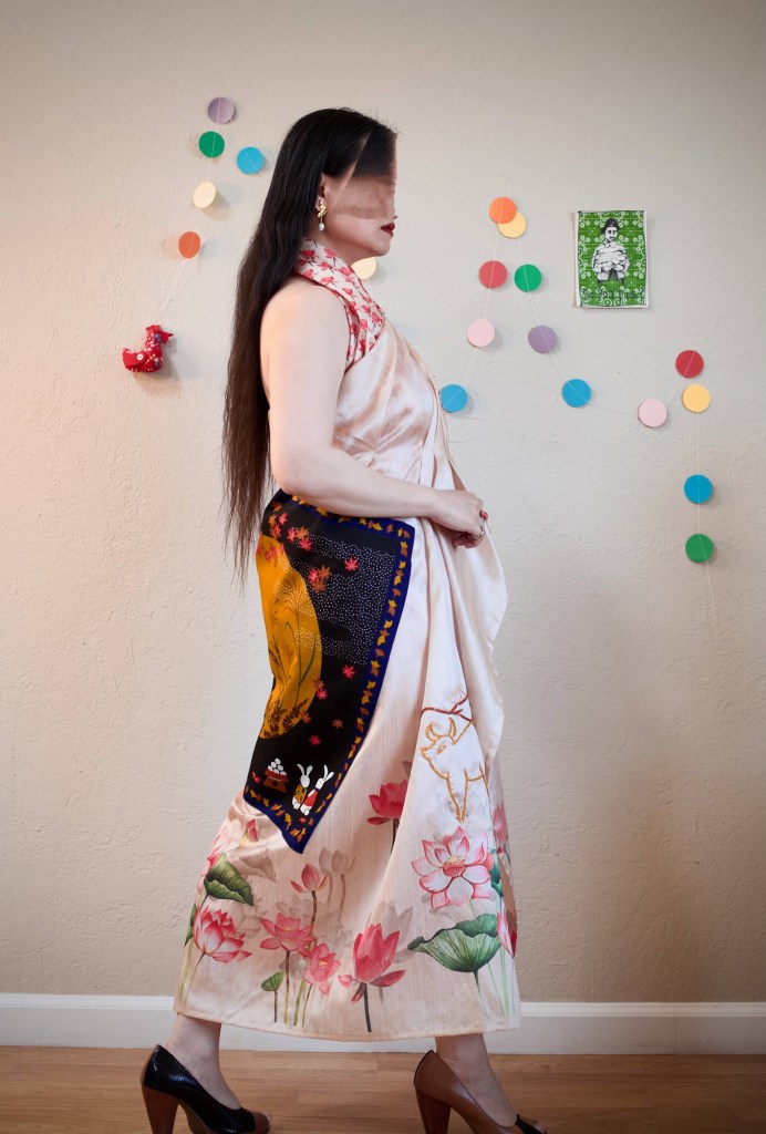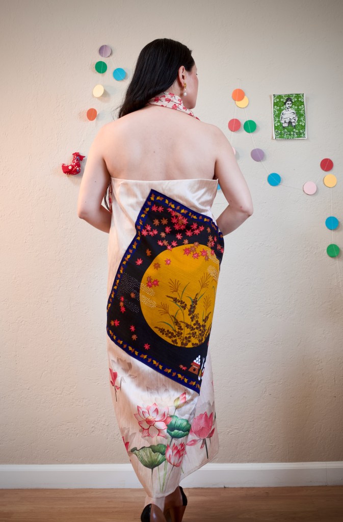 Inspired by his poem, I have crafted this dress, embroidered with the motif of a boy, lolling on his water buffalo while daydreaming of Luna, who is depicted on a furoshiki cloth adorned at the back of the dress.