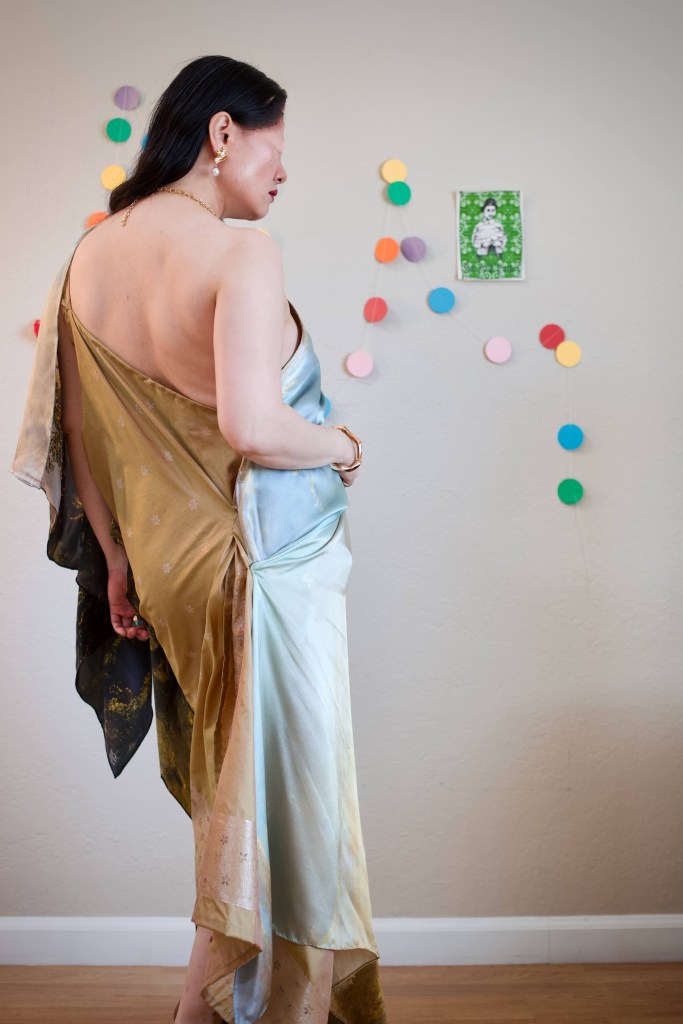 These verses are from the poem Thanatopsis – its title derived from the Greek words “thanatos” and “opsis”, which means “a meditation on death.” Writing the poem between the age of 17 and 22, Bryant was initially doubted to be its authentic author. Then associate editor of the North American Review was quoted to say of the poem, “No one, on this side of the Atlantic, is capable of writing such verses.” The following lines depict the view from the cemetery that inspired Durand’s painting Landscape – Scene from “Thanatopsis”, which is featured on the silk scarf adorning this dress: