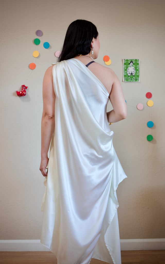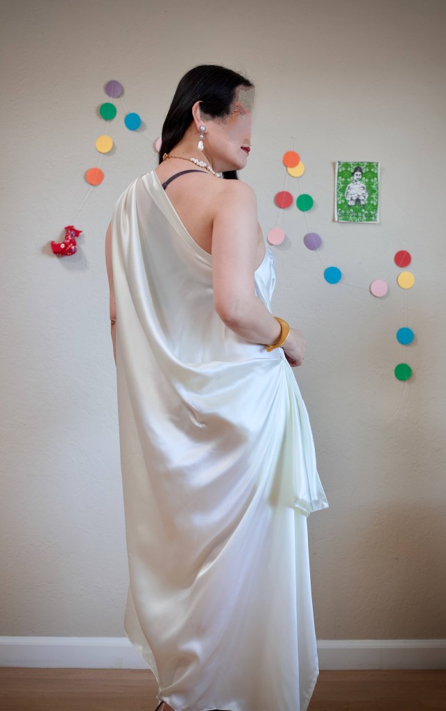 In the Vatican City, Raphael’s 16th-century fresco School of Athens depicts the scholars of antiquity gathering under one roof. Plato and his student Aristotle take central positions. On the far right stand Claudius Ptolemy and Plotinus. Among all the men stands the only woman, Hypatia, who gazes directly at us. Crafted from two silk rectangles, this dress is inspired by her white robe.