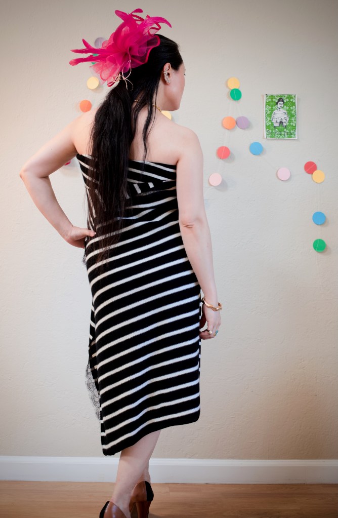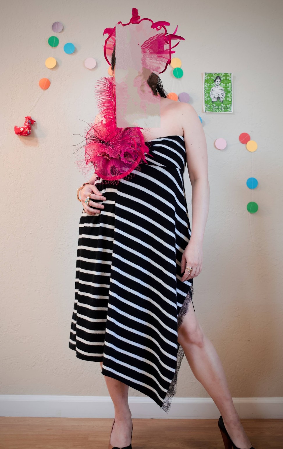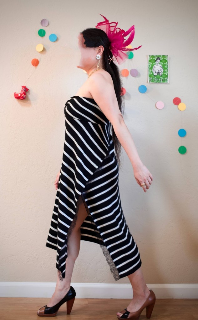Inspired by the city of Paris, I have crafted this dress from a cashmere rectangle of the striped pattern, a fashion pattern as representative of France as the Eiffel Tower. The striped pattern was first introduced on the marinière as the French Navy’s uniform in 1858. It became a fashion staple when the fashion designer Coco Chanel took seaside holidays in this Navy style. The feather adornments are inspired by those worn by Cancan dancers of the Moulin Rouge, who propelled this dance to a very popular art form throughout the 19th and 20th century.