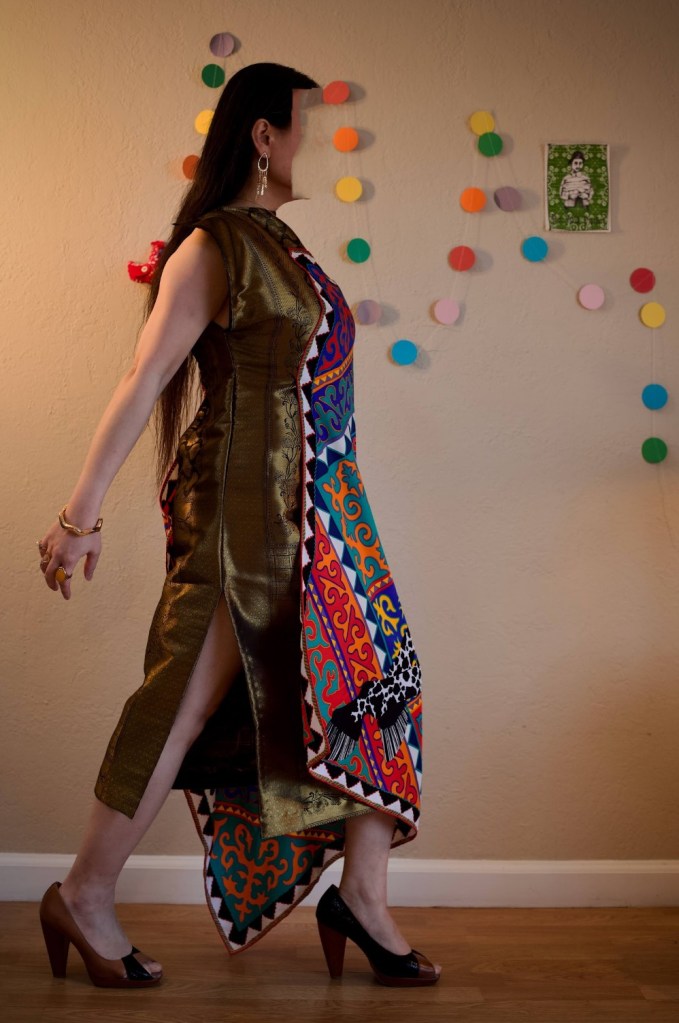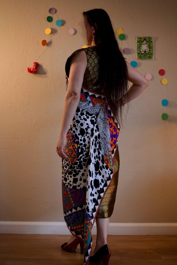 Others were bred for looks, such as the Appaloosa featured on this dress. The horse is best known for its colorful spotted coat pattern, also known as the leopard complex. Depictions of spotted horses have been found in prehistoric cave paintings in Europe, and artworks featuring domesticated spotted horses appeared since ancient Greece and Han Dynasty China. The Appaloosa’s color pattern is genetically the result of various spotting patterns overlaid on top of one of several recognized base coat colors. Appaloosas have an eightfold greater risk of developing blindness, a side effect from the leopard complex.